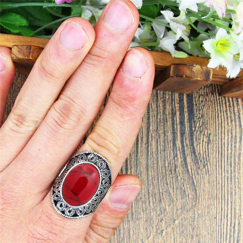 Designed with the modern individual in mind, our Vintage Hollow Flower Oval Stone Ring is a must-have accessory for your next party. Made from high-quality and durable zinc alloy, this unisex ring features a beautiful plant design that is sure to make a statement. With a 20mm surface width and a bar setting, it offers a perfect fit for any finger. Available in a variety of sizes, it is the ideal choice for any fashion-forward individual looking to add a touch of vintage charm to their wardrobe. Plus, with our trusted brand name and origin in Mainland China, you can count on the quality and reliability of this stunning ring.